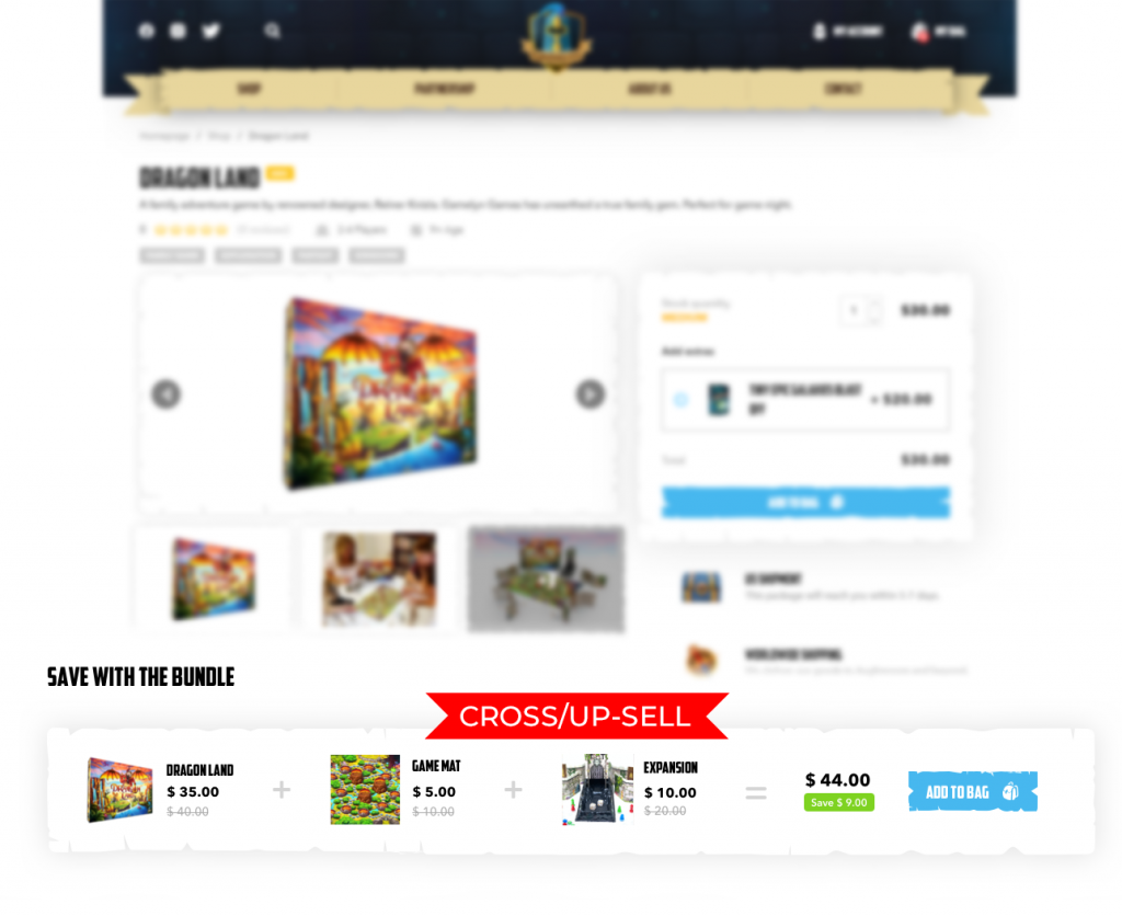 It should not come as a surprise that using cross-selling and up-selling techniques is one of the more effective practices to not only increase sales volume but also to boost your AOV. This is particularly true in the case of board games – there are many examples of complementary products (cards, pawns, mats, posters, card protectors, etc.) which can be offered with the base game, resulting in great cross-selling opportunities. Cross-selling elements are best used in many places across the platform: on the product page, in the cart and on the payment page; however, before you do so you need to investigate and check at which part of the purchasing path your customers will be the most likely to add something to their shopping list.