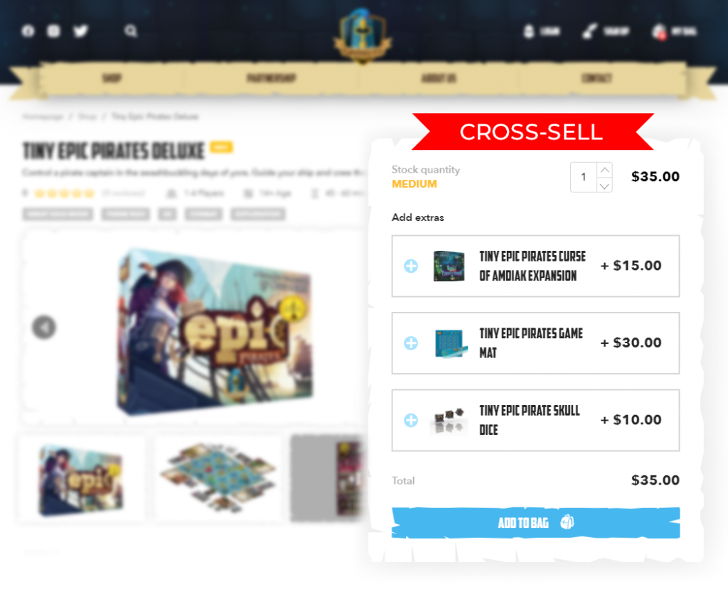 Among the goals for the new platform was increasing the average order value, or AOV for short – by the way, you should definitely read the post about boosting AOV, written with board game publishers in mind. Board games seem to be the perfect product for exploiting cross-selling techniques – offering the prospective buyers some additional products based on goods that they have already selected – buy a sword, and get some draconid oil for it, as well as up-selling methodologies, for example by suggesting a better variant of the same product – buying a sword? Maybe we could interest you in a sword with +15 damage modifier against ghouls?). The key here is to make the suggestions more than just a pushy cash grab – we need to present them in a way that makes them seem like advice concerning an actual need (which users may not even know about yet). In the case of cross-selling, we decided to focus on suggestions while adding a product to the cart and in the cart itself.